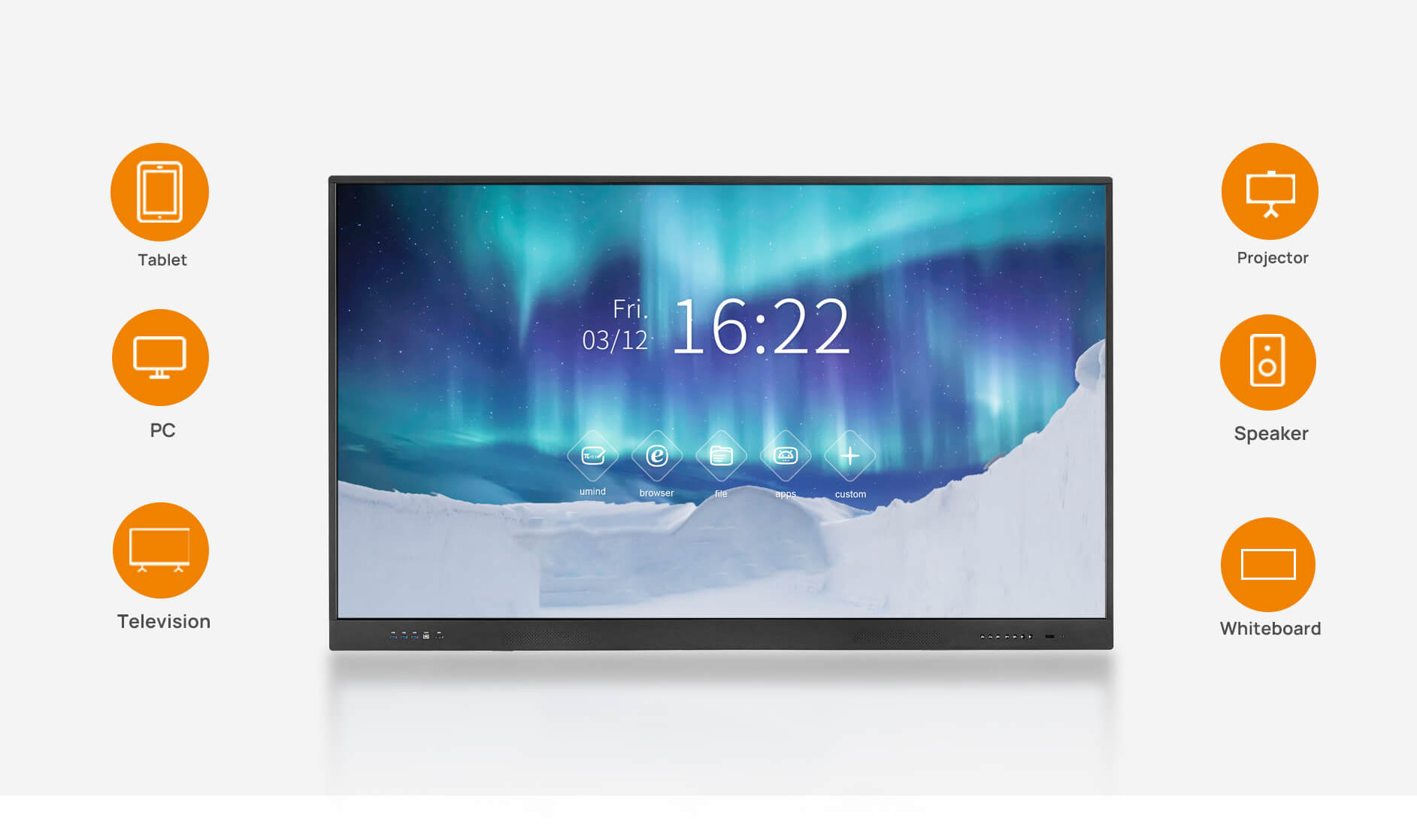 支持手机,平板,电脑无线投屏.通过E-Share或Trans-screen可让您连接自己的设备并将任何屏幕投射到一体机上。