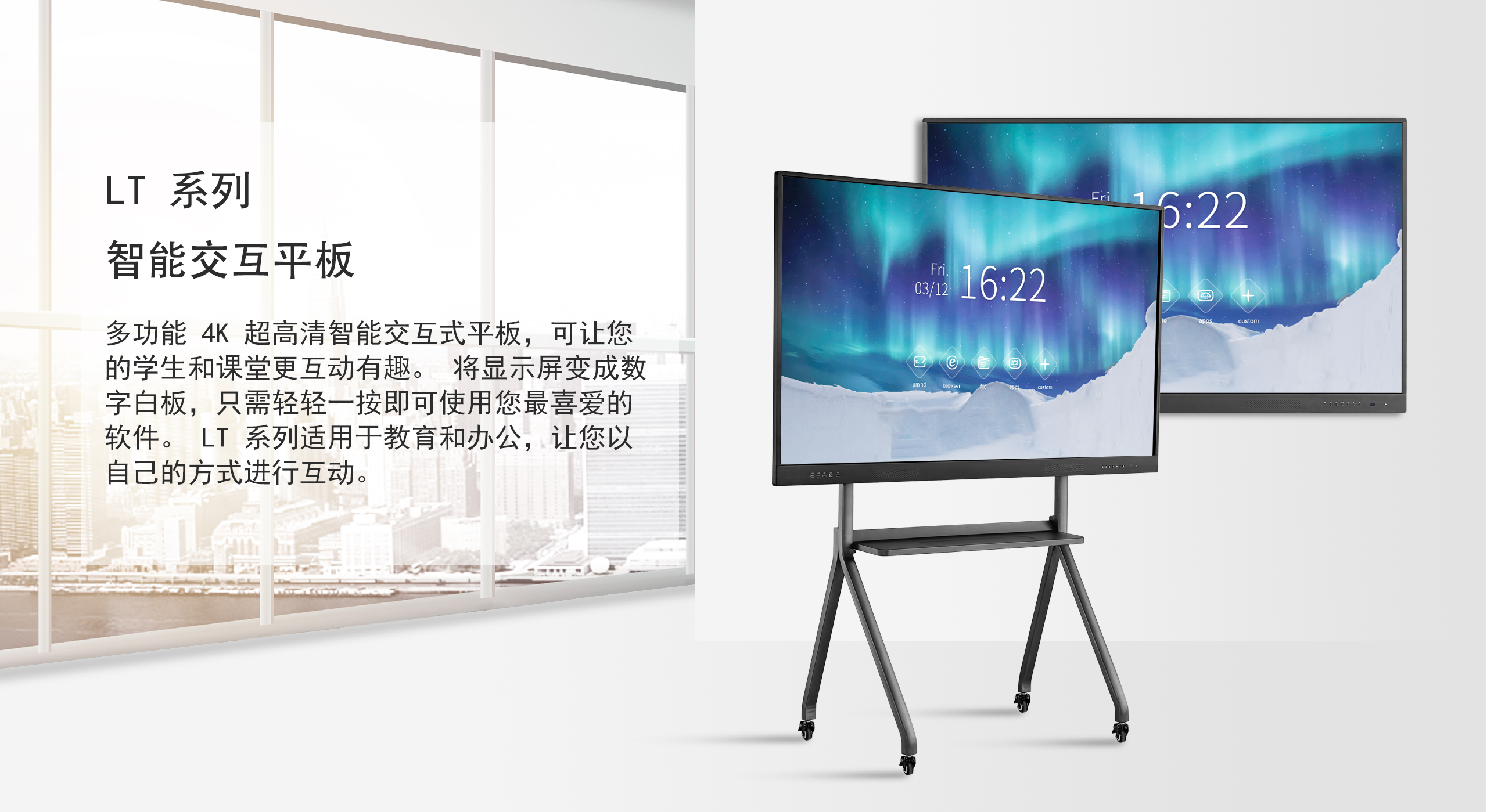 LT 系列教学会议一体机可以为您的班级和团队带来效率,方便您随时随地轻松互动。 它凭借轻巧超薄的框架设计、Windows 系统和内置安卓操作系统支持、嵌入式工具和个性化用户界面,是学校和办公室和培训无缝协作的高效解决方案